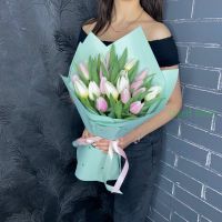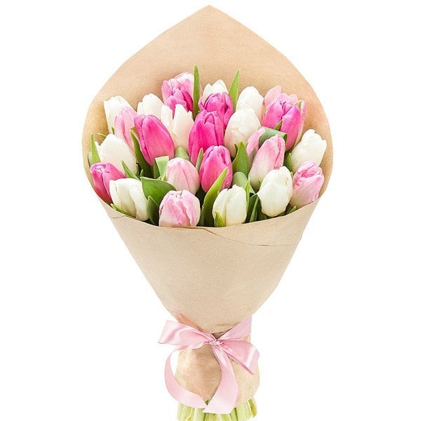 Когда с неба падают звезды – стоит загадать желание, ну а когда дарят такой красивый букет – то это говорит о наличии чувств. Розовые тюльпаны смотрятся не просто очаровательно, но также и немного загадочно. Букет «Нежный поцелуй» понравится юной школьнице и невинной студентке, счастливой невесте и веселой имениннице. Эта композиция состоит из тюльпанов розового и белого цвета, украшенных атласной лентой и крафт бумагой.